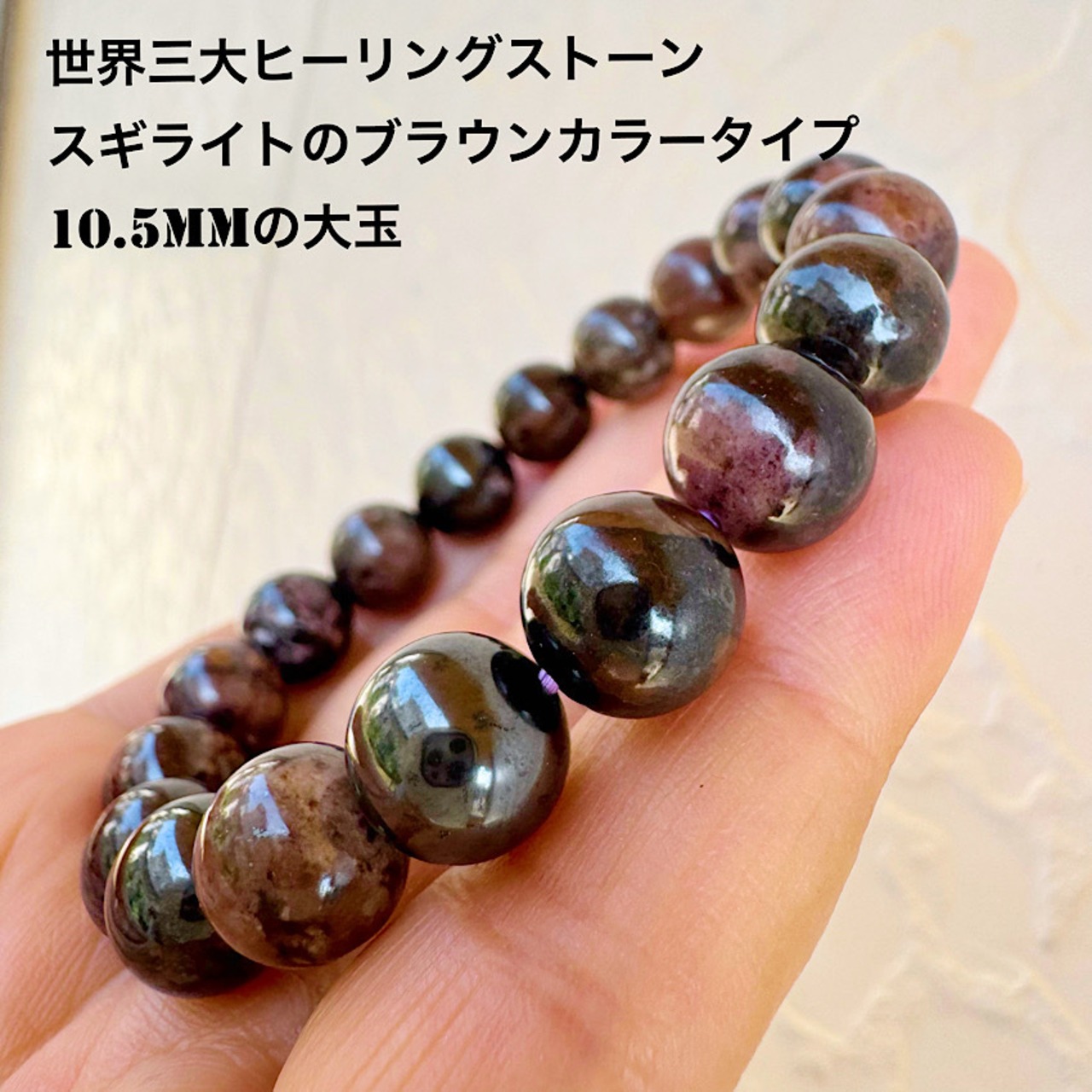 美しいブラウンカラースギライトを使用した「【心を癒す】ブラウンカラースギライト(杉石) 10.5mmの大玉 天然石ブレスレット」は、あなたの手元に特別な癒しとエネルギーをもたらすアイテムです。