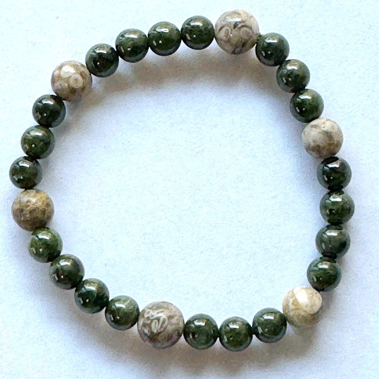 キャッツアイダイオプサイトは「直感」と「洞察」を象徴し、持つ人に自己理解を深める助けをするとされています。その独特な光の反射が、あなたのスタイルに神秘的なアクセントを加え、周囲に特別な印象を与えるでしょう。また、麦飯石は「心の平穏」と「調和」を助け、穏やかな色合いが安らぎを与えます。このブレスレットは、シンプルでありながらも心を和ませる存在感を演出しています。