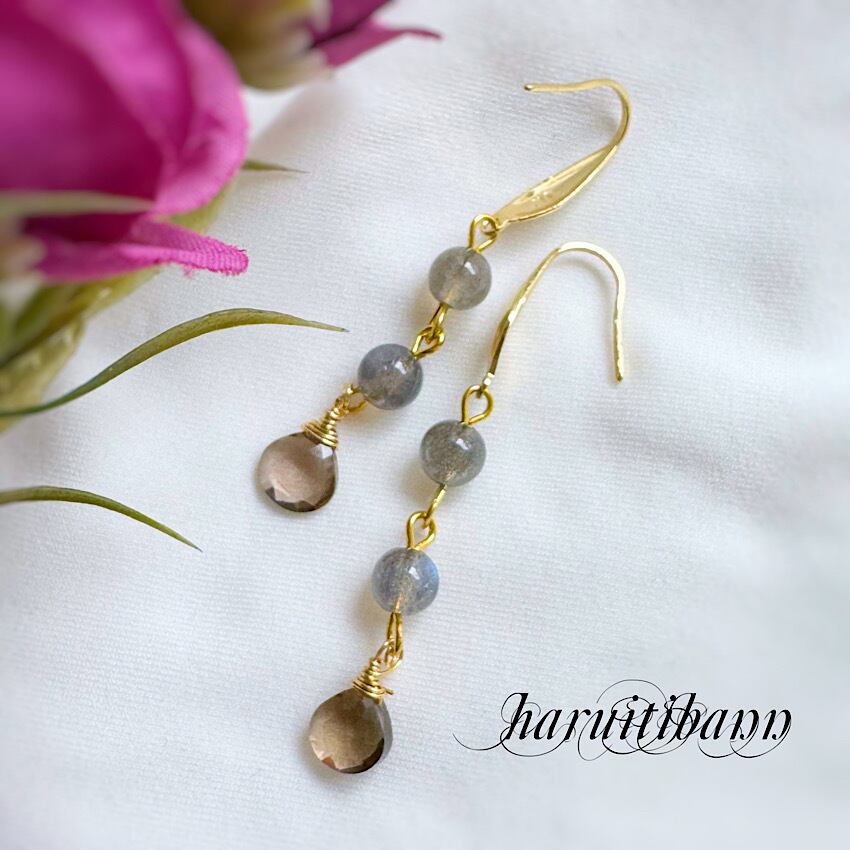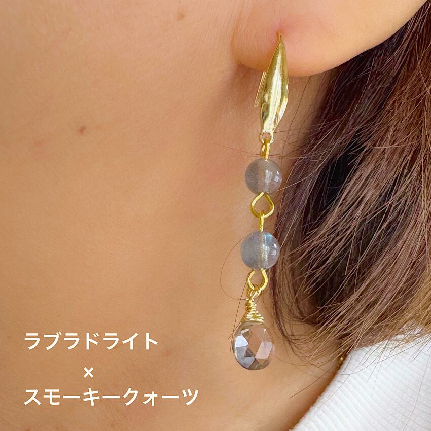 ラブラドライト6mm&スモーキークォーツマロンカット ゆらゆら揺れる美しい天然石ピアス サージカルステンレス 金属アレルギー対応 イヤリング ノンホールピアス変更無料 | haruitibann 天然石 アクセサリー 春一番