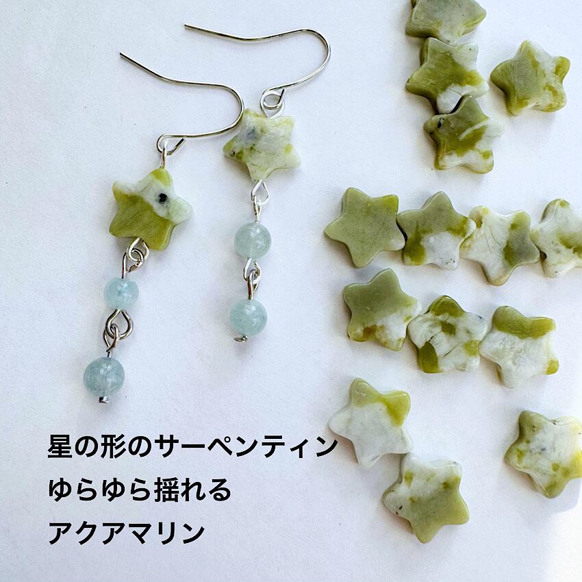 【可愛い揺れが魅力】サーペンティン星型&アクアマリン ゆらゆら揺れる可愛いピアス 天然石ピアス パワーストーンピアス ステンレスフック 金属アレルギー対応