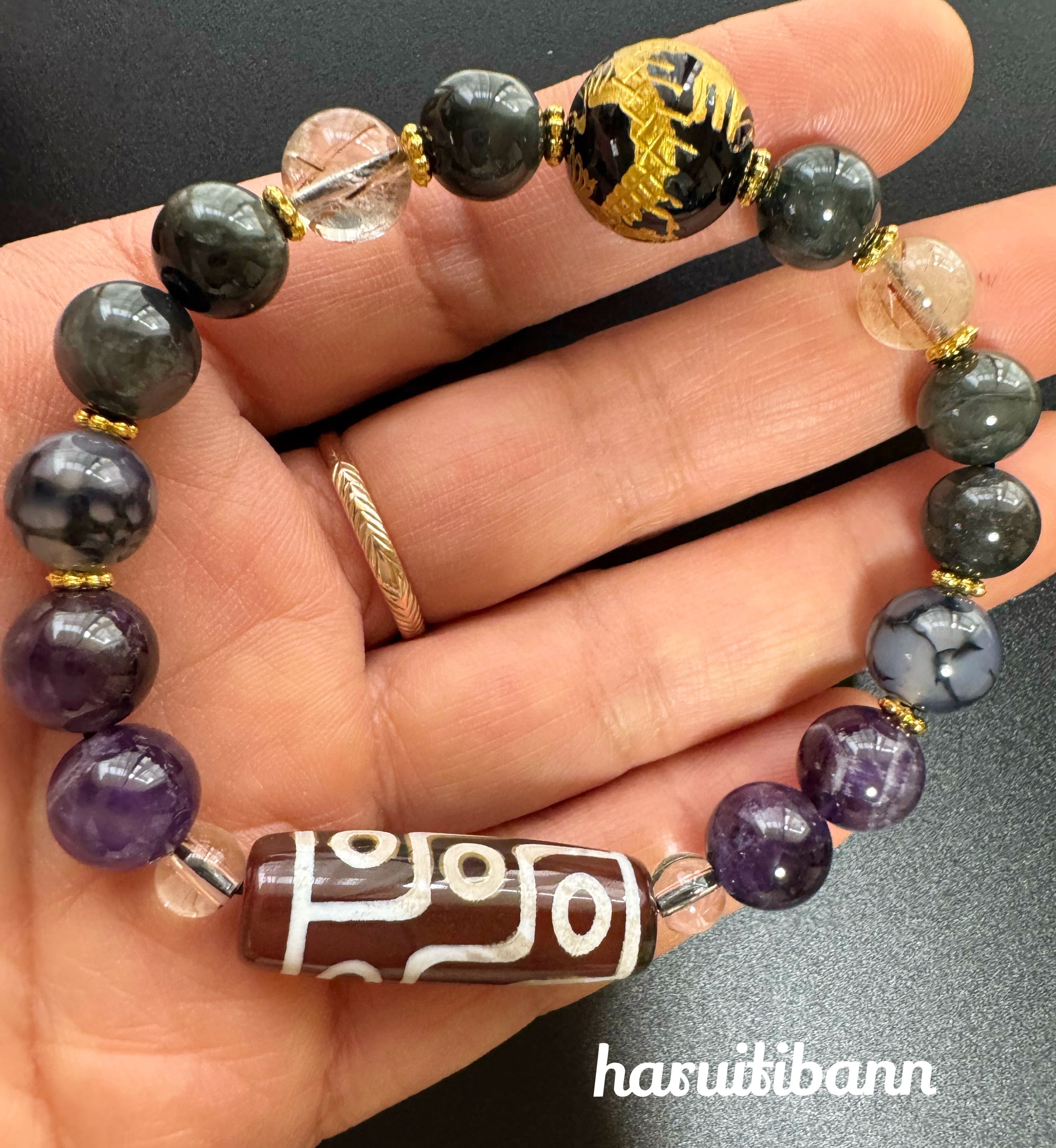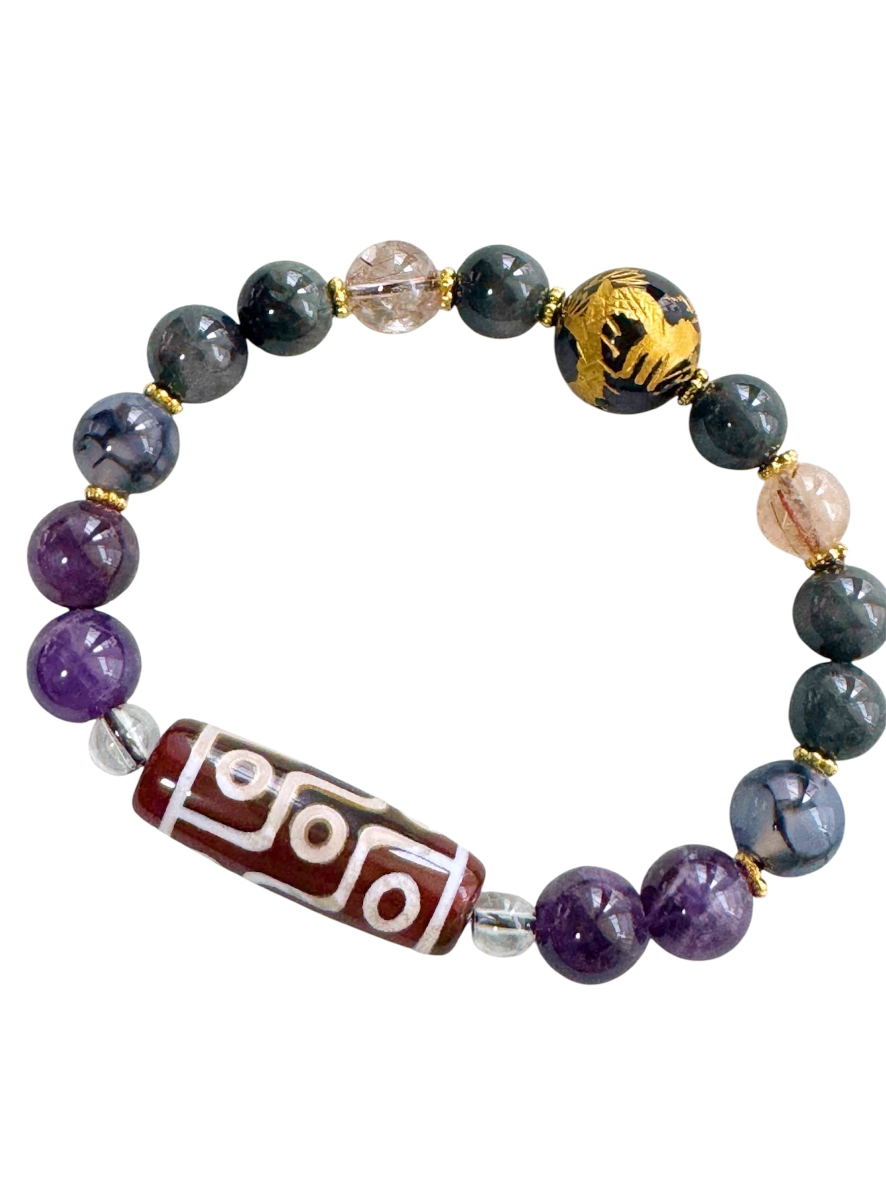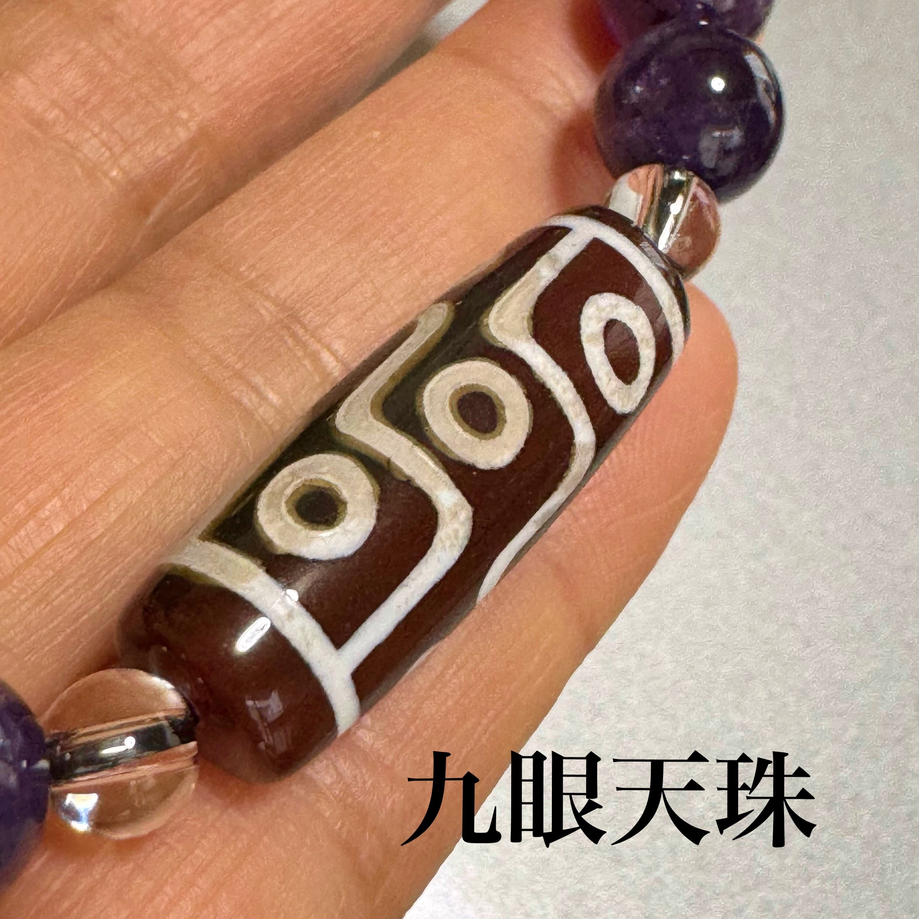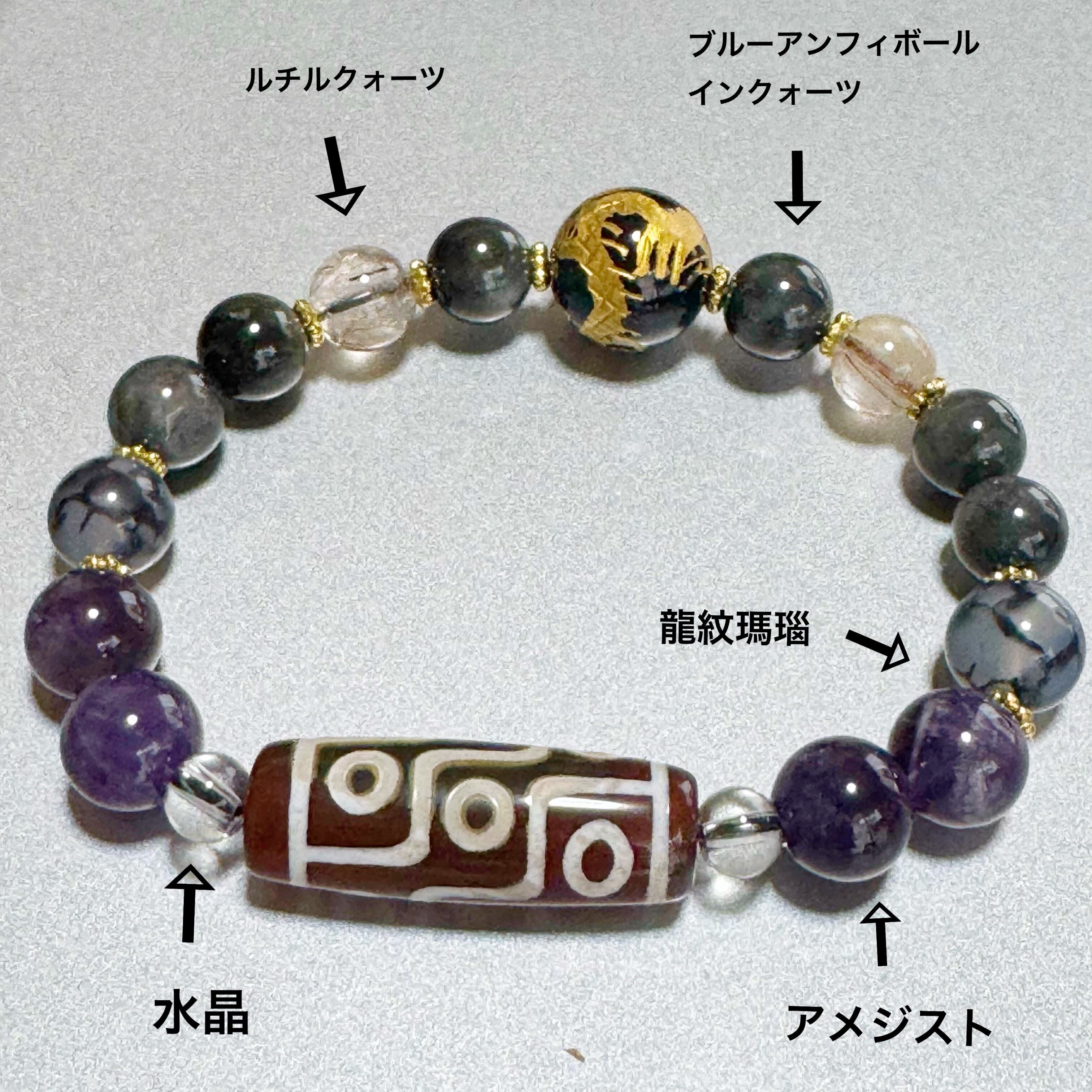 九眼天珠 &五爪龍掘り水晶14mm&ブルーアンフィボールインクォーツ9mm&ルチルクォーツ8.5mm&龍紋瑪瑙10mm&アメジスト10mm 天然石ブレスレット パワーストーンブレスレット メンズアクセサリー ユニセックスアクセサリー | haruitibann 天然石 アクセサリー 春一番