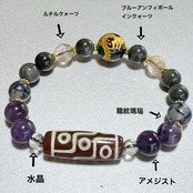 九眼天珠、五爪龍掘り水晶、ブルーアンフィボールインクォーツ、ルチルクォーツ、龍紋瑪瑙、アメジスト