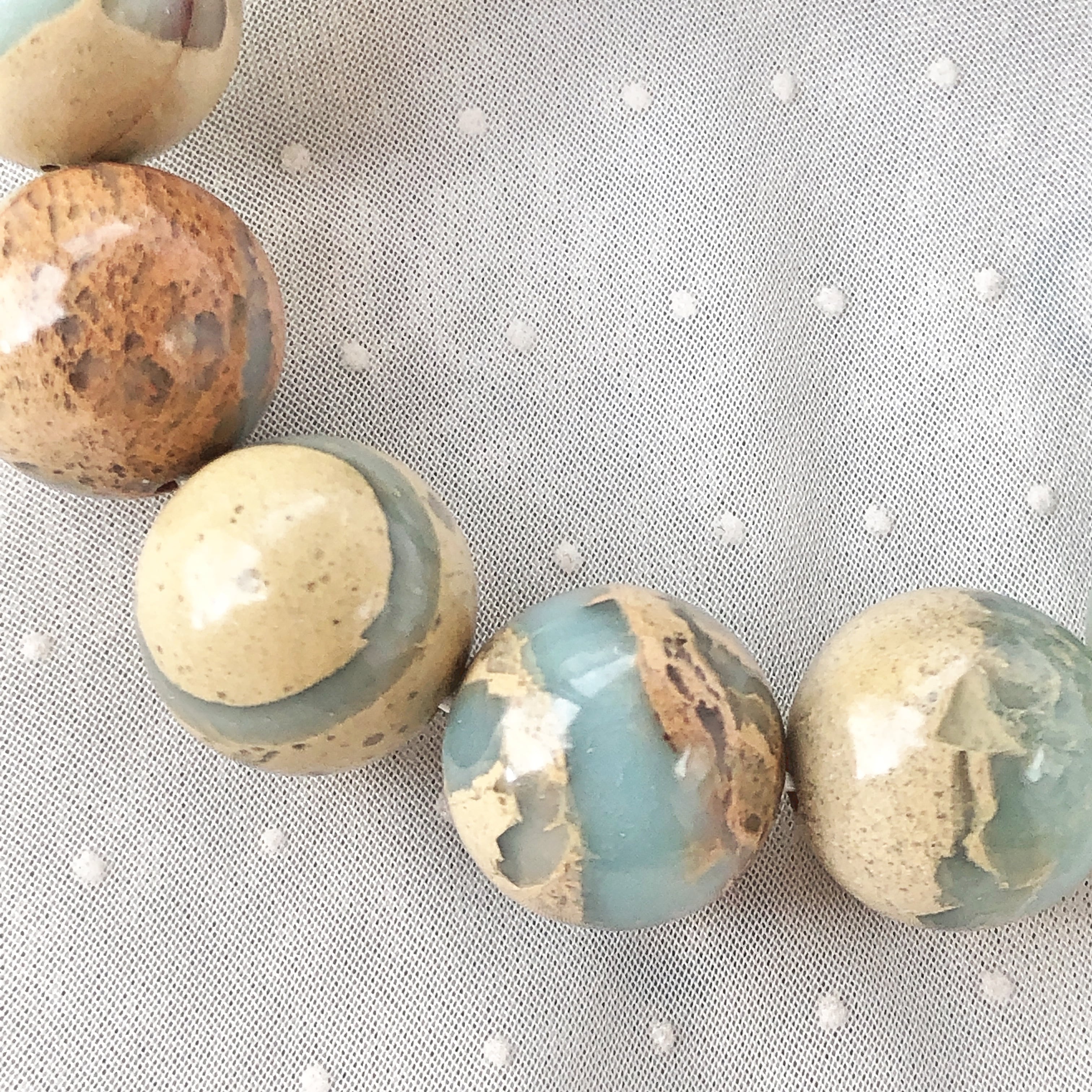 淡いグリーンにベージュやブラウンの模様が混ざり合った芸術的な天然石です