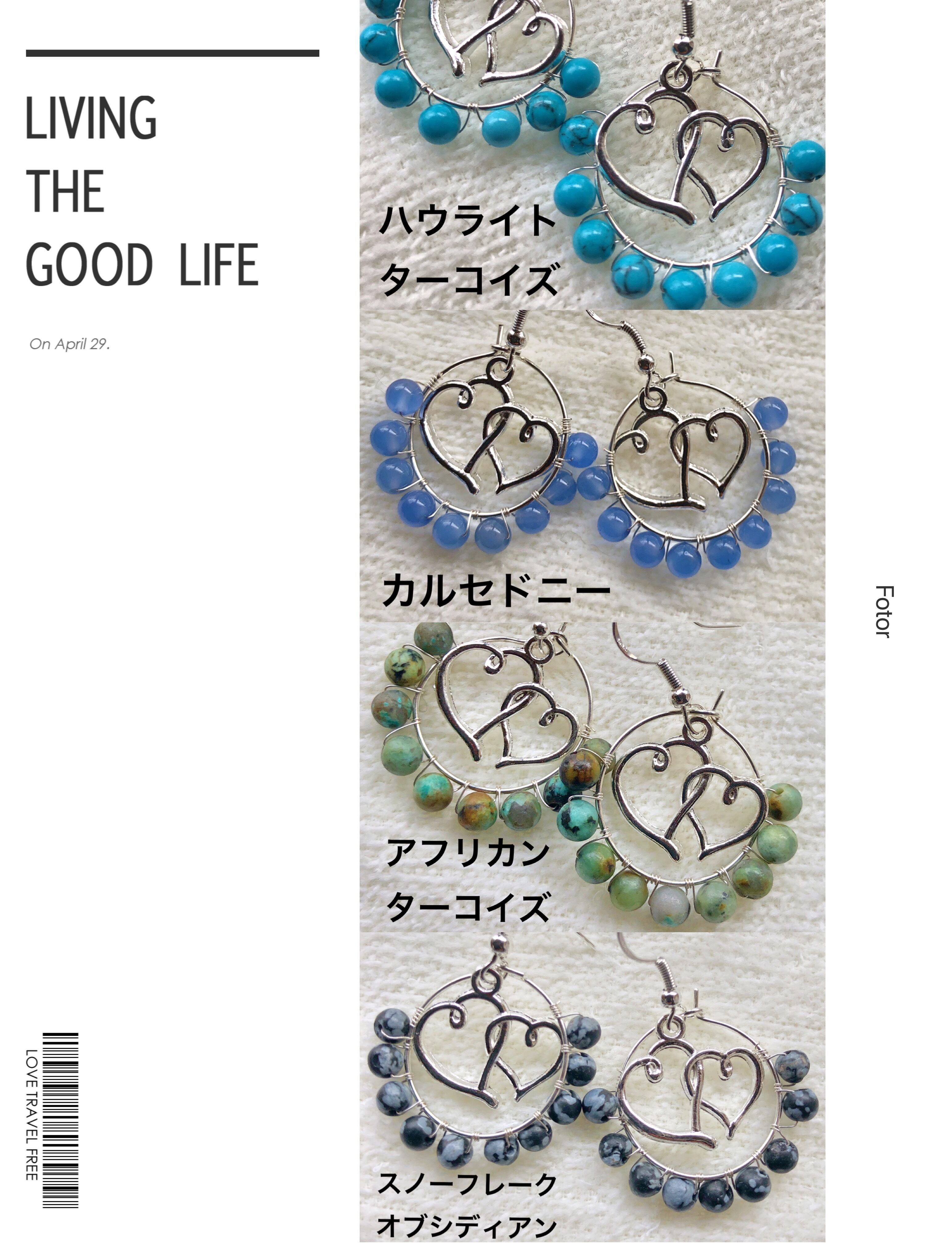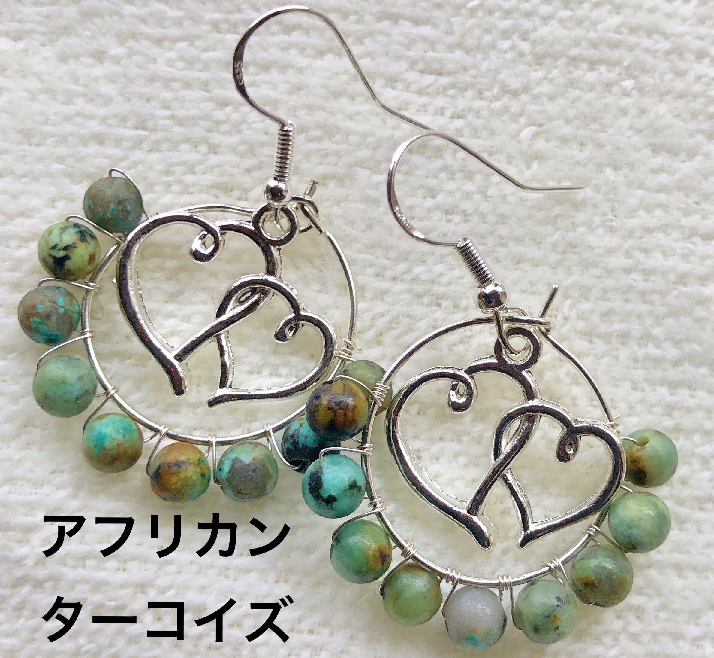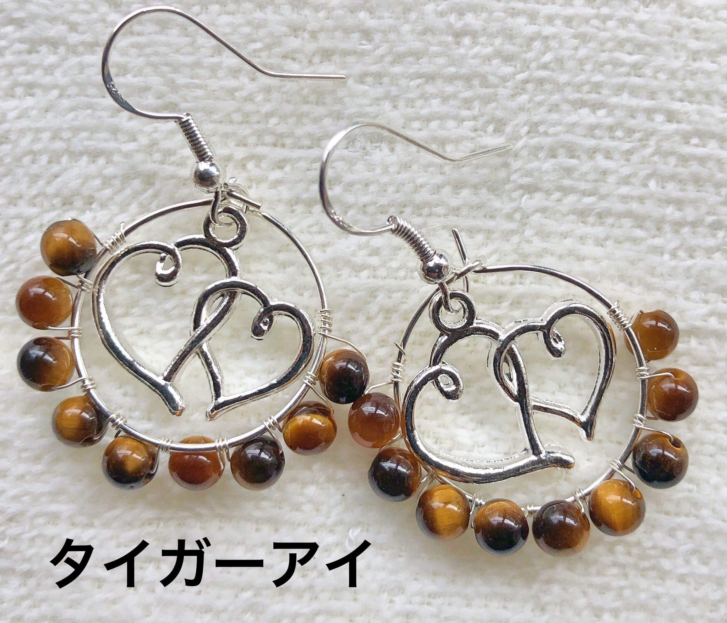 4mmの天然石を付けたフープピアスに、中央に可愛いダブルハートを付けました