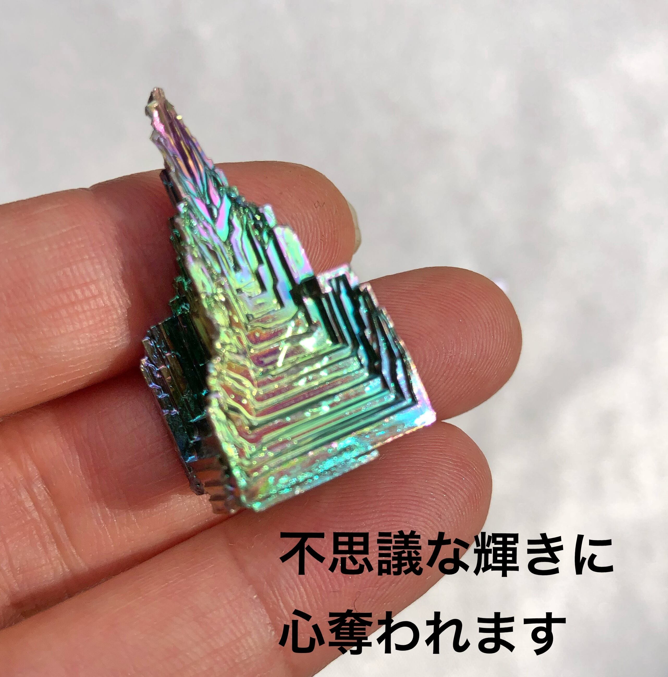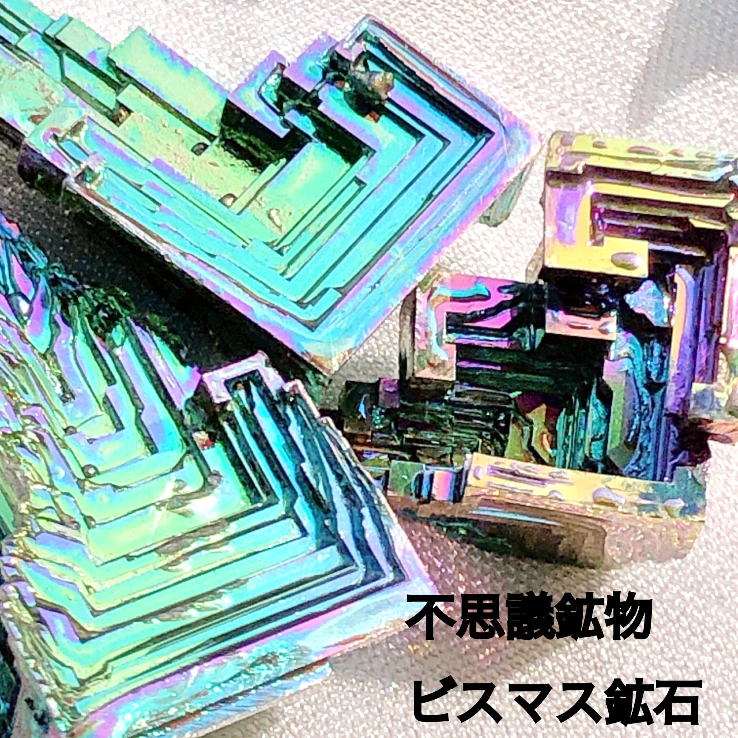 酸化被膜の厚さによって干渉色は変化し、被膜の厚さはビスマスが融解していた時間や温度、冷却時間によって変わるため、人工ビスマスは虹色の光沢を放つのです。