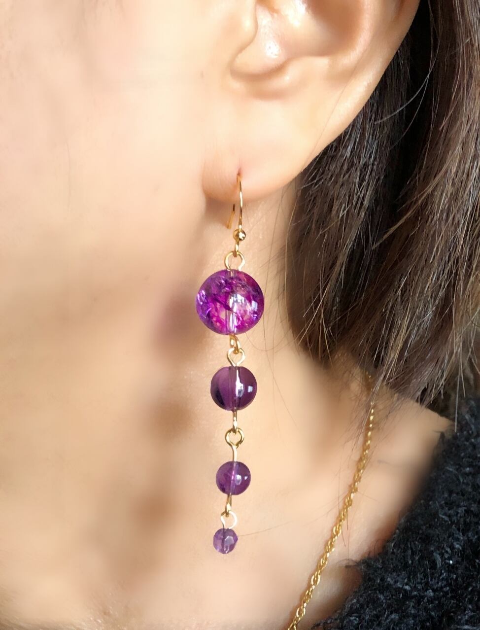 耳元でゆらゆら揺れる美しいパープルのパワーストーンが、パッと目を引き、貴女を美しく引き立てる、そんなアクセサリーです