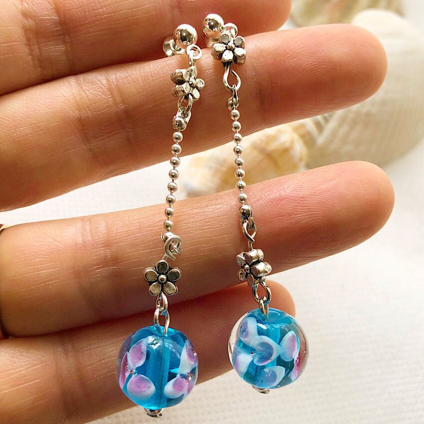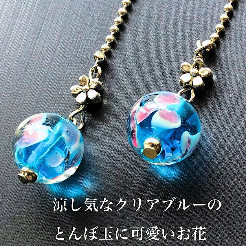 涼し気なクリアブルーのガラスにお花模様を閉じ込めた、可愛いとんぼ玉のピアスです