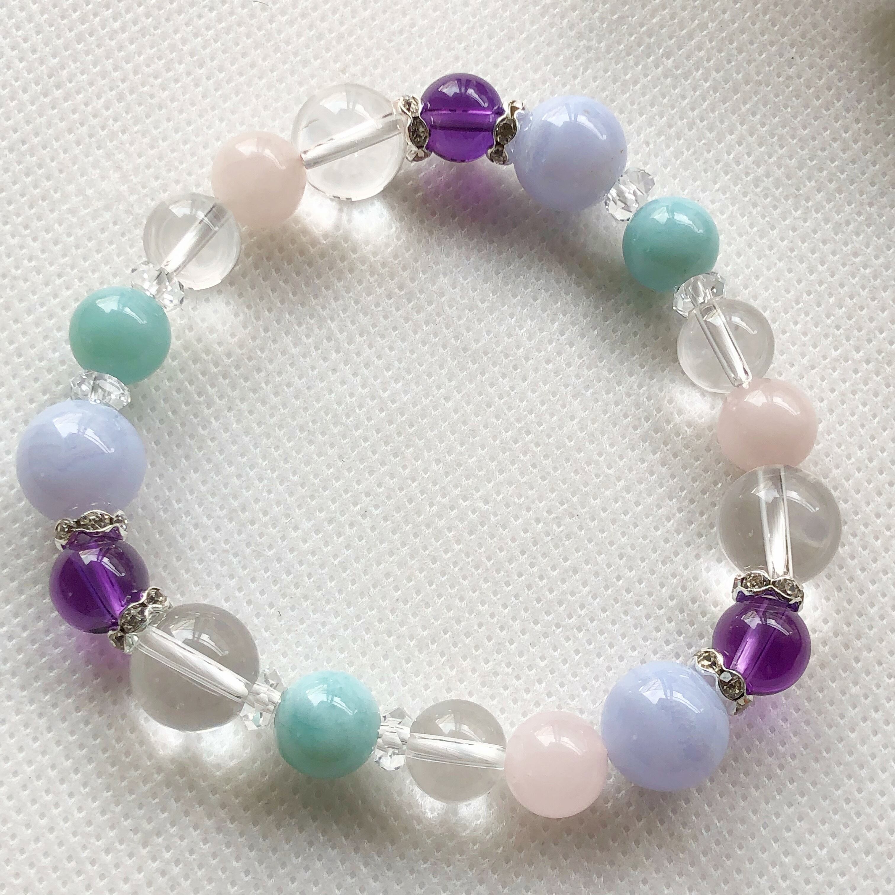 ブルーレースアゲートの和名は「空色縞瑪瑙」。 その名の通り、水色の瑪瑙に縞模様が入ったものをブルーレース(またはブルーレースアゲート)と呼びます。 控えめで清潔感のあるブルーレースは、持ち主をリラックスさせて、心を綺麗にしてくれるようなヒーリング作用があると伝えられています。