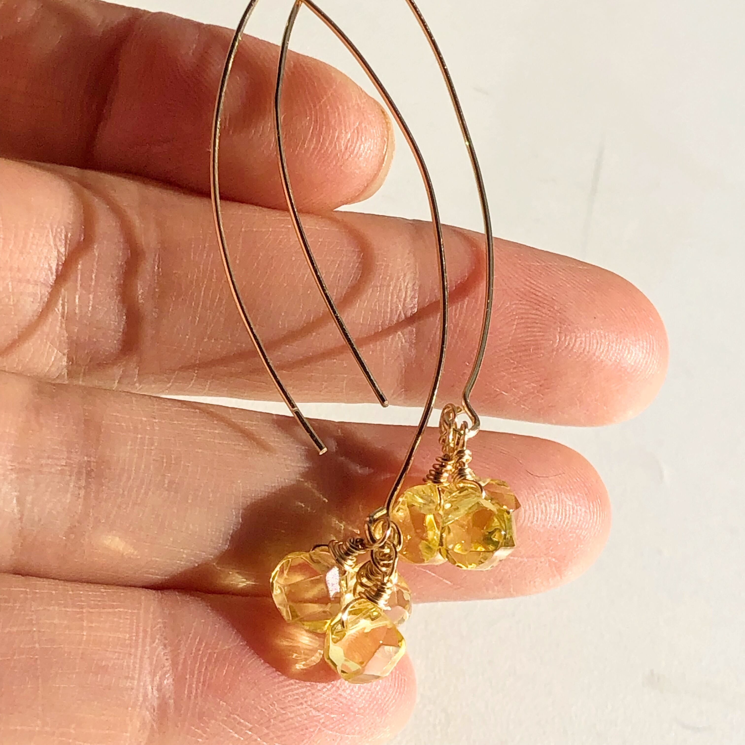 ちょっと大振りのマーキスフックをアーティスティックワイヤーで作り、先にキラキラ光るシャンパントパーズを3粒ずつ配置致しました