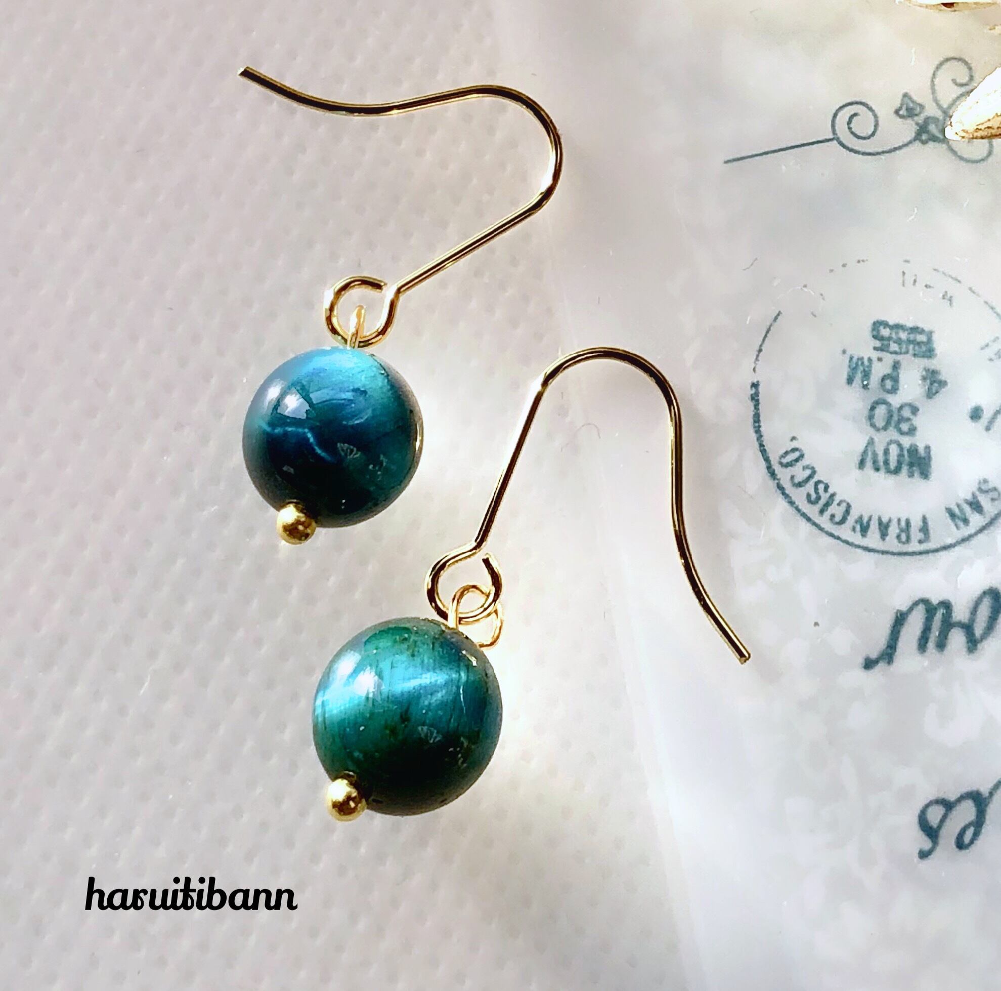綺麗なロイヤルブルーのタイガーアイ8mmの、シンプルな1粒ピアスです