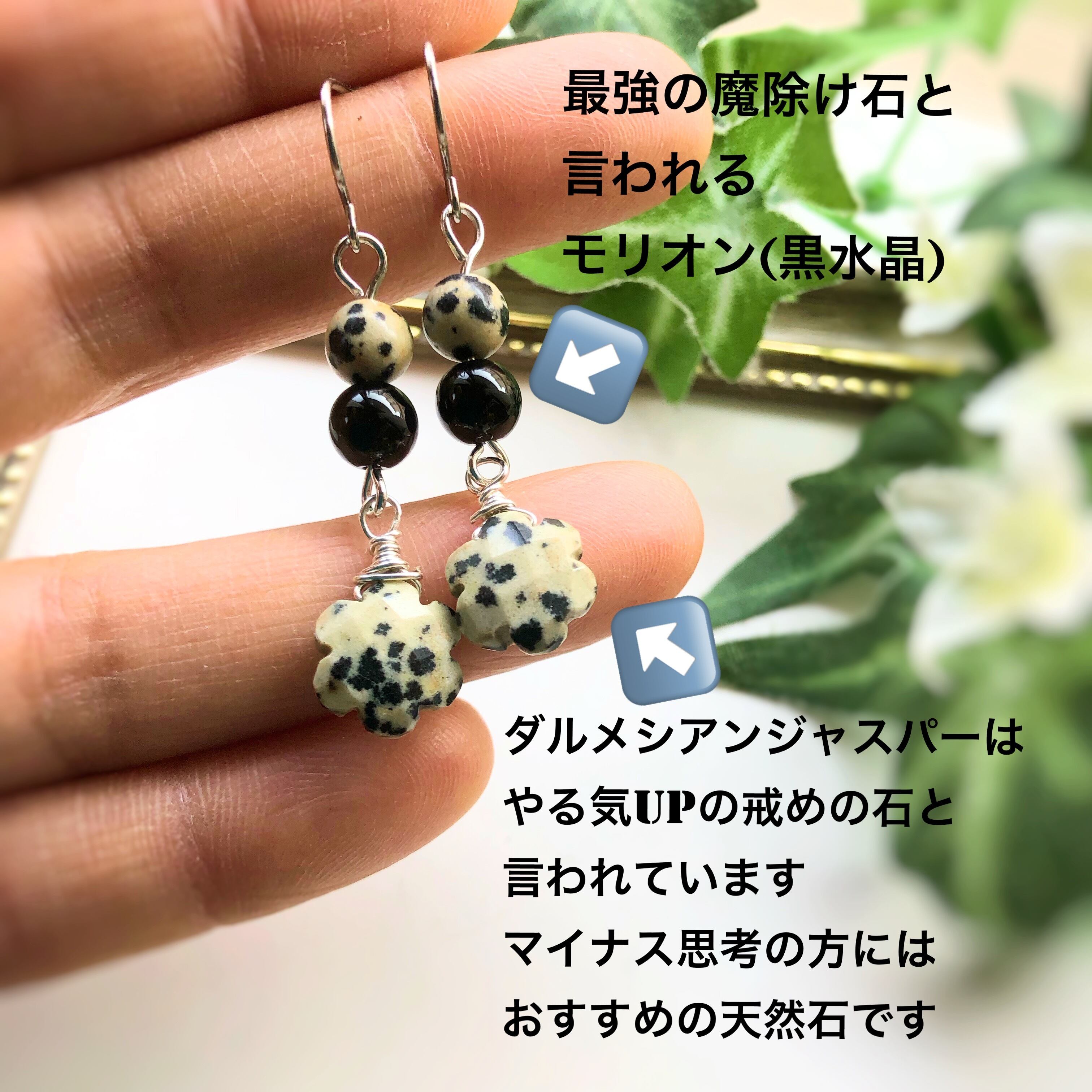 可愛いお花型のダルメシアンジャスパーが魅力的なゆらゆら揺れるロングピアスです