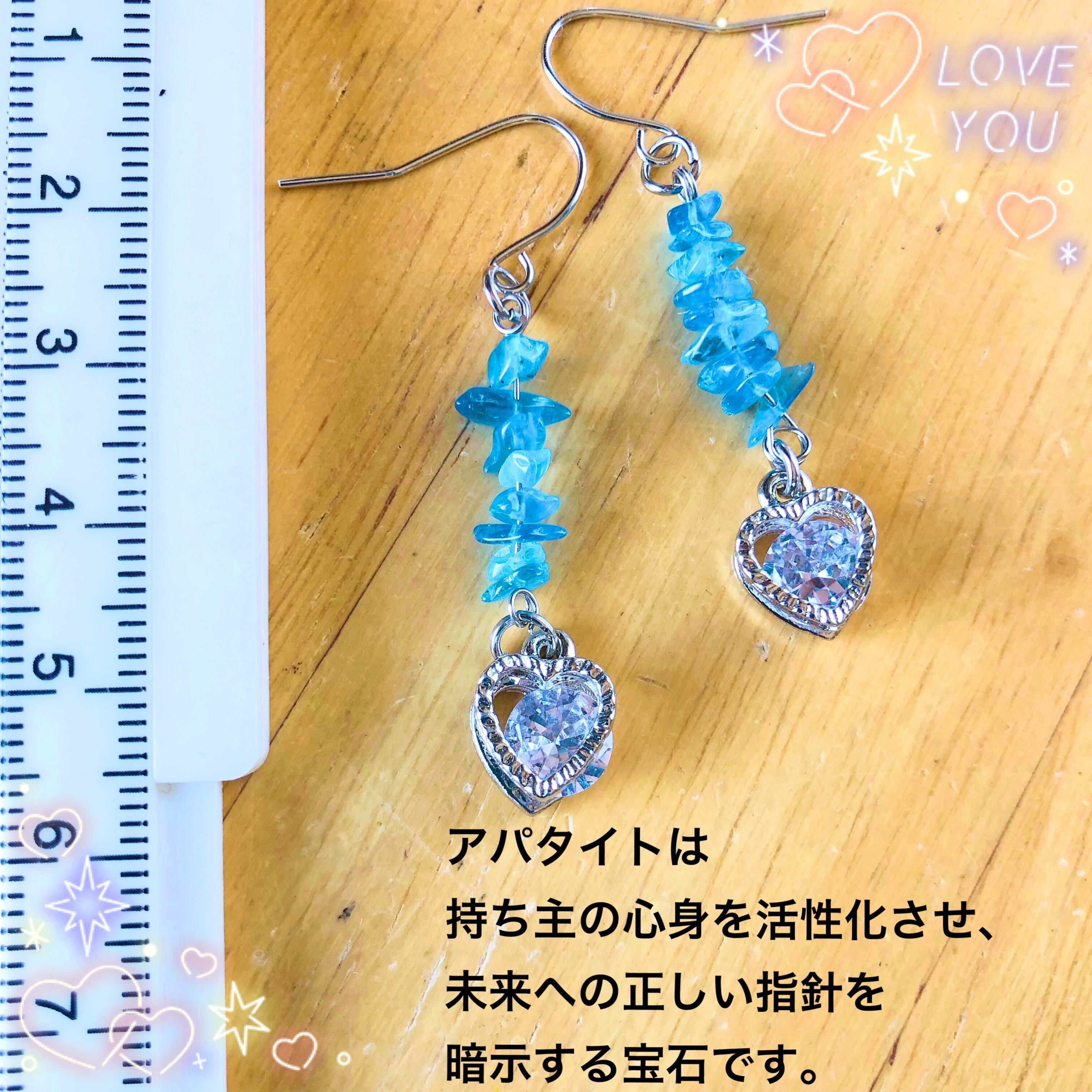 宝石質の天然石、アパタイトを使いハートのチャーム(クリスタルガラス入り)を揺らしたロングピアスです