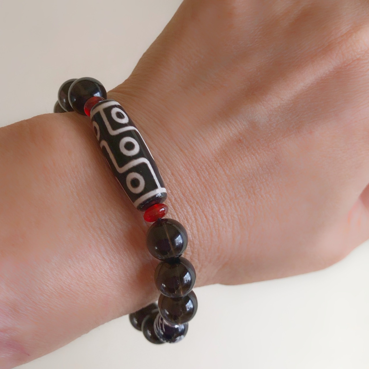 これらのパワーストーンが集結した最強パワー九眼天珠×人気五爪龍堀オニキス スモーキークォーツ天然石ブレスレットは、願いを叶え、良い運気を引き寄せるためのお守りとして、パワフルなアイテムです。