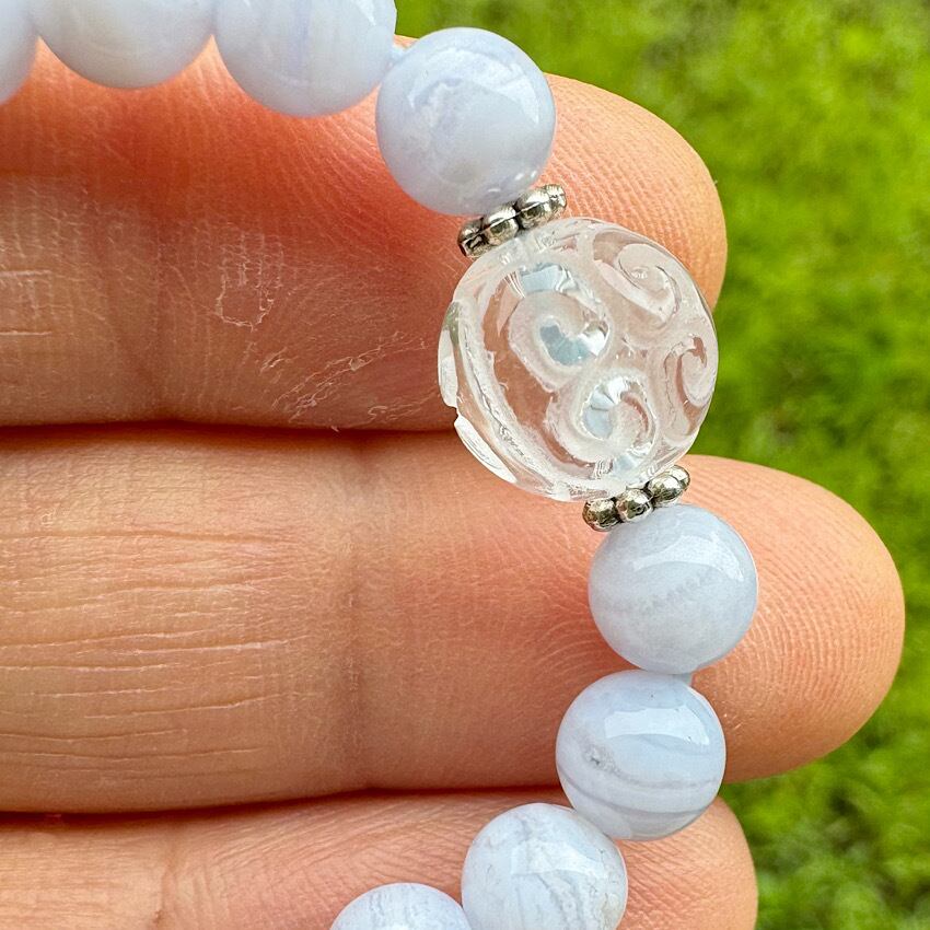 ブルーレースアゲードは古来より心の平穏をもたらす石として知られ、水晶は悪運を払い、ポジティブなエネルギーを引き寄せるとされています。