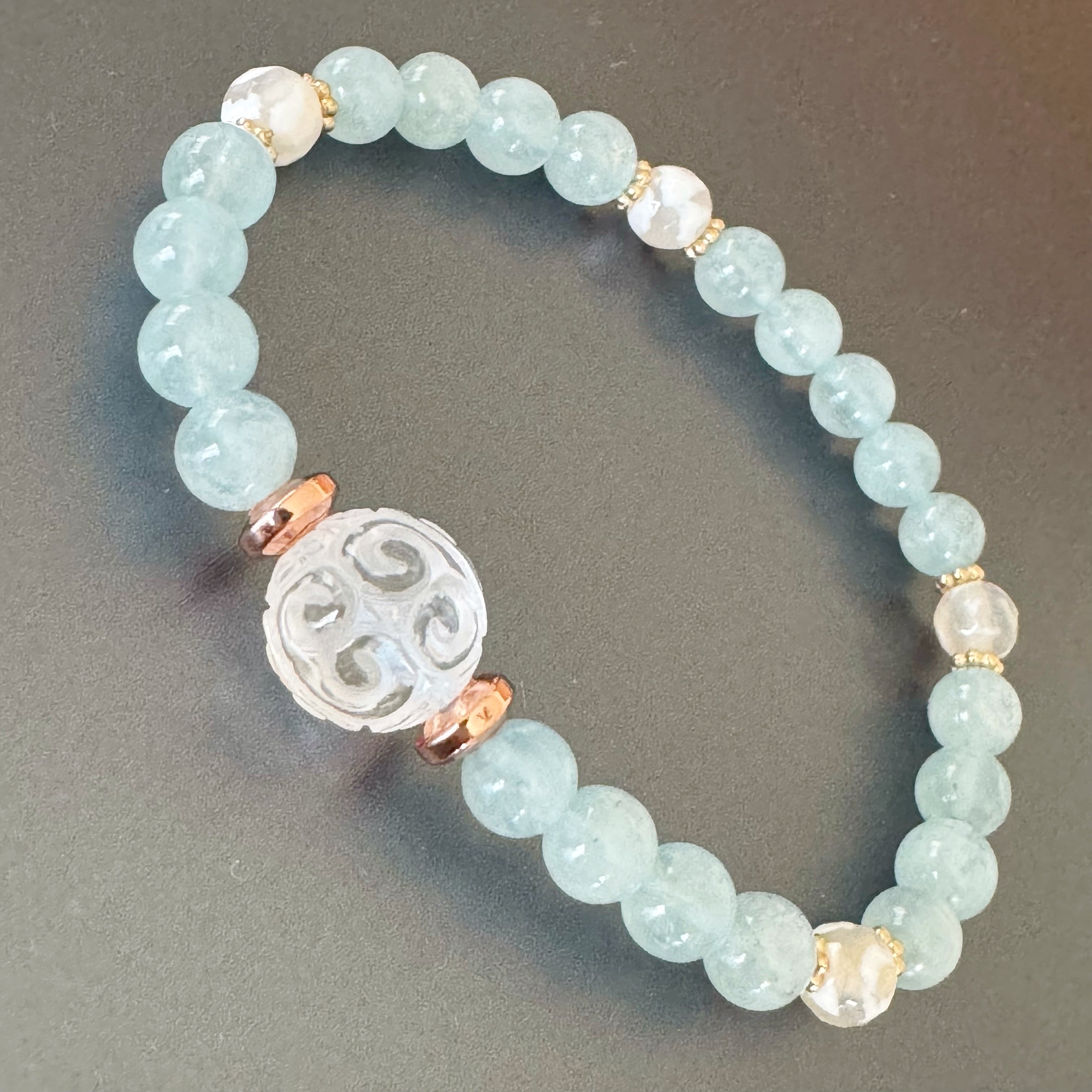 爽やかなアクアマリンを中心に使い、人気の水晶回紋珠をポイントに入れた、お守りブレスレットです