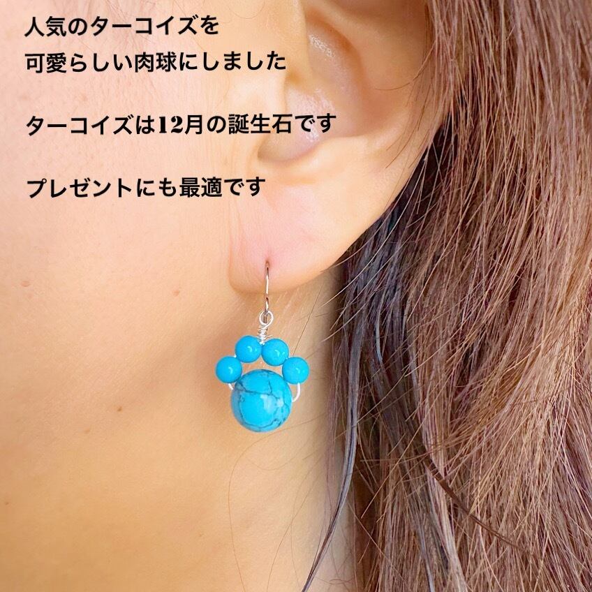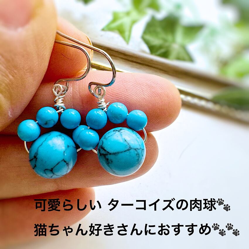 愛らしい肉球デザインのターコイズピアスは、あなたの耳元を楽しく彩るアイテムです。