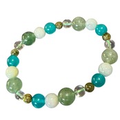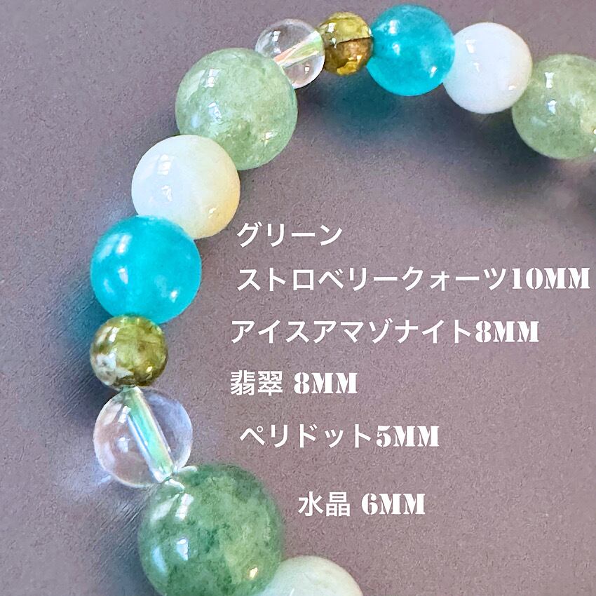 ## グリーンの安らぎ 天然石ブレスレット グリーンストロベリークォーツ10mm アマゾナイト8mm 翡翠8mm ペリドット5mm 水晶6mm パワーストーンブレスレット